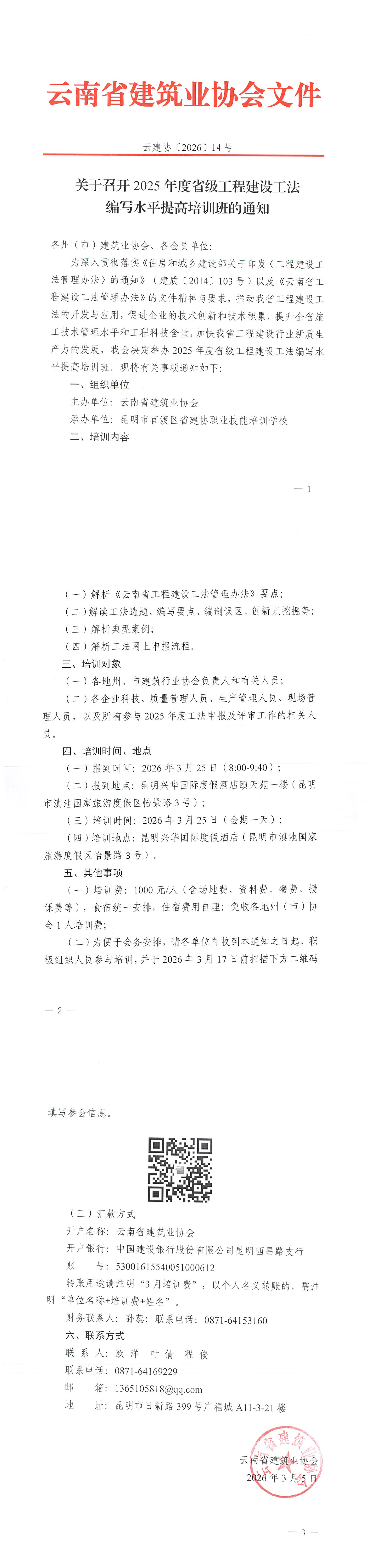 云建协〔2026〕14号关于召开2025年度省级工程建设工法编写水平提高培训班的通知