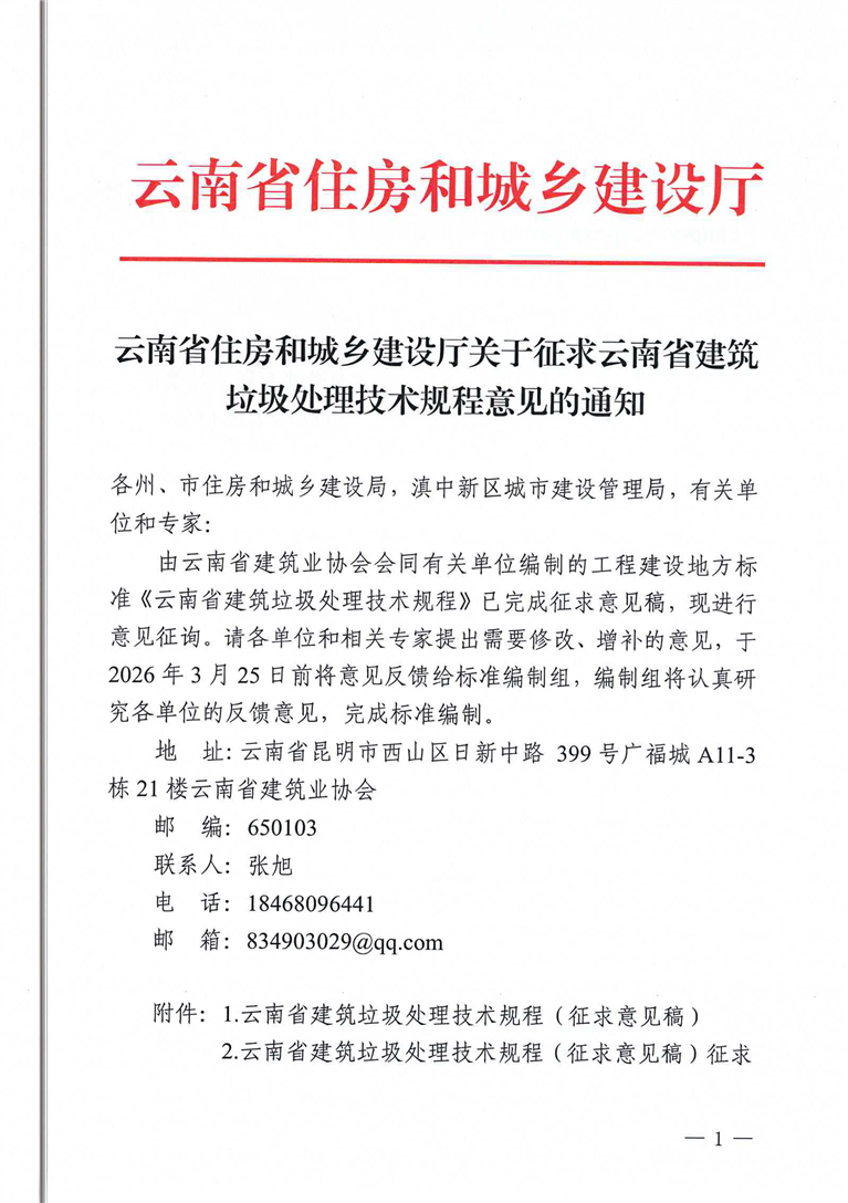 云南省住房和城乡建设厅关于征求云南省建筑垃圾处理技术规程意见的通知